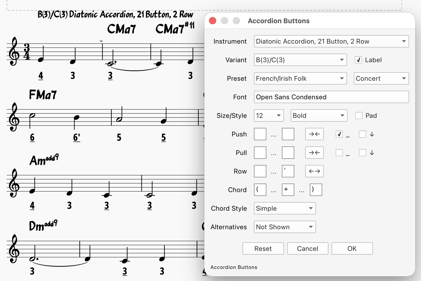 This plugin annotates the score with the accordion button numbers (or harmonica holes) for the notes.